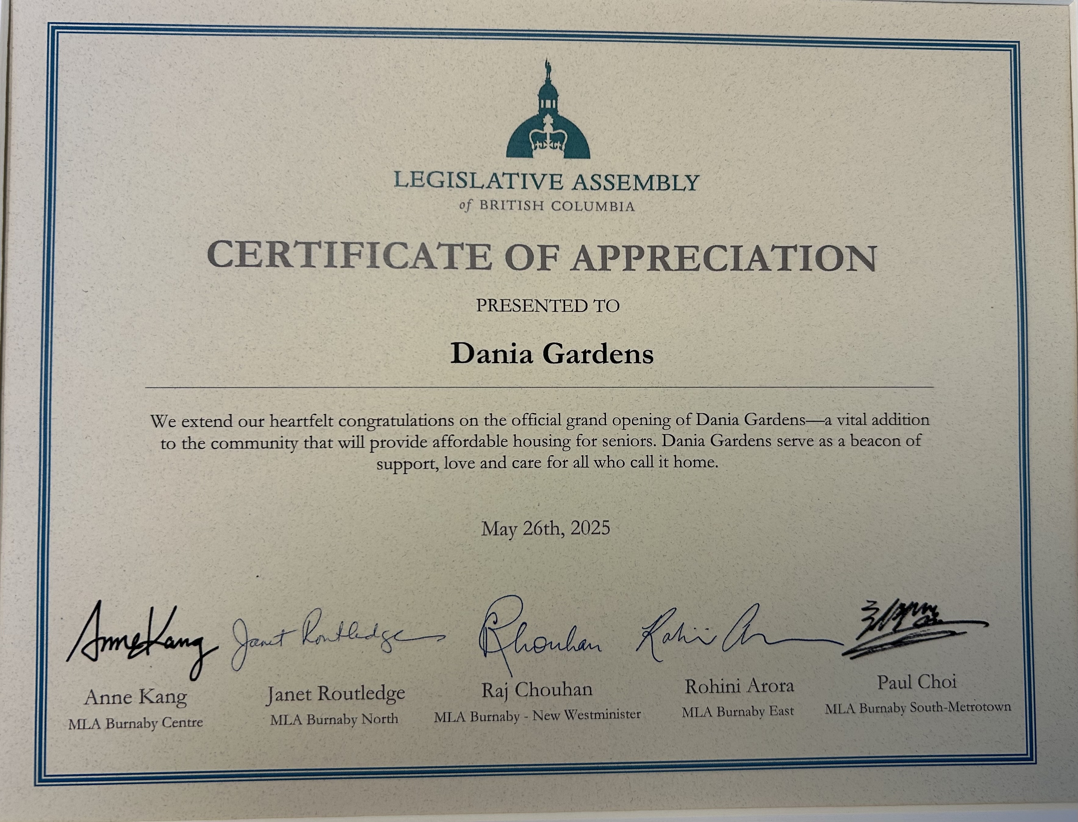 We also want to thank BC Premier David Eby, Minister of Housing Ravi Kahlon and MLAs Raj Chouhan, Anne Kang, Janet Routledge, Rohini Arora and Paul Choi for sending a joint Certificate of Appreciation that was displayed at the event. (They were unable to come due to their pre-set Legislature schedule in Victoria, BC). Dania Society is thankful for the enormous support that Province has given through BC Housing in making this new Dania Gardens possible for seniors.